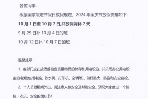 国庆节放假通知各位同事:根据国家法定节假日放假规定,2024年国庆节放假安排如下 10月1日至10月7日,共放假调休7天 9 月 29 日补 10月4日的班 10月12日补10月7日的班 温馨提示:1、各部门应在放假前检查贵重物品的储存和用电设施,并关闭办公用电设备的电源(包括电脑、饮水机、打印机、空调等)。做好防火、防盗和安全自检。2、个人节假期间外出,请注意人身安全及财物安全。预祝大家度过一个愉快、欢乐、安全的国庆节!
