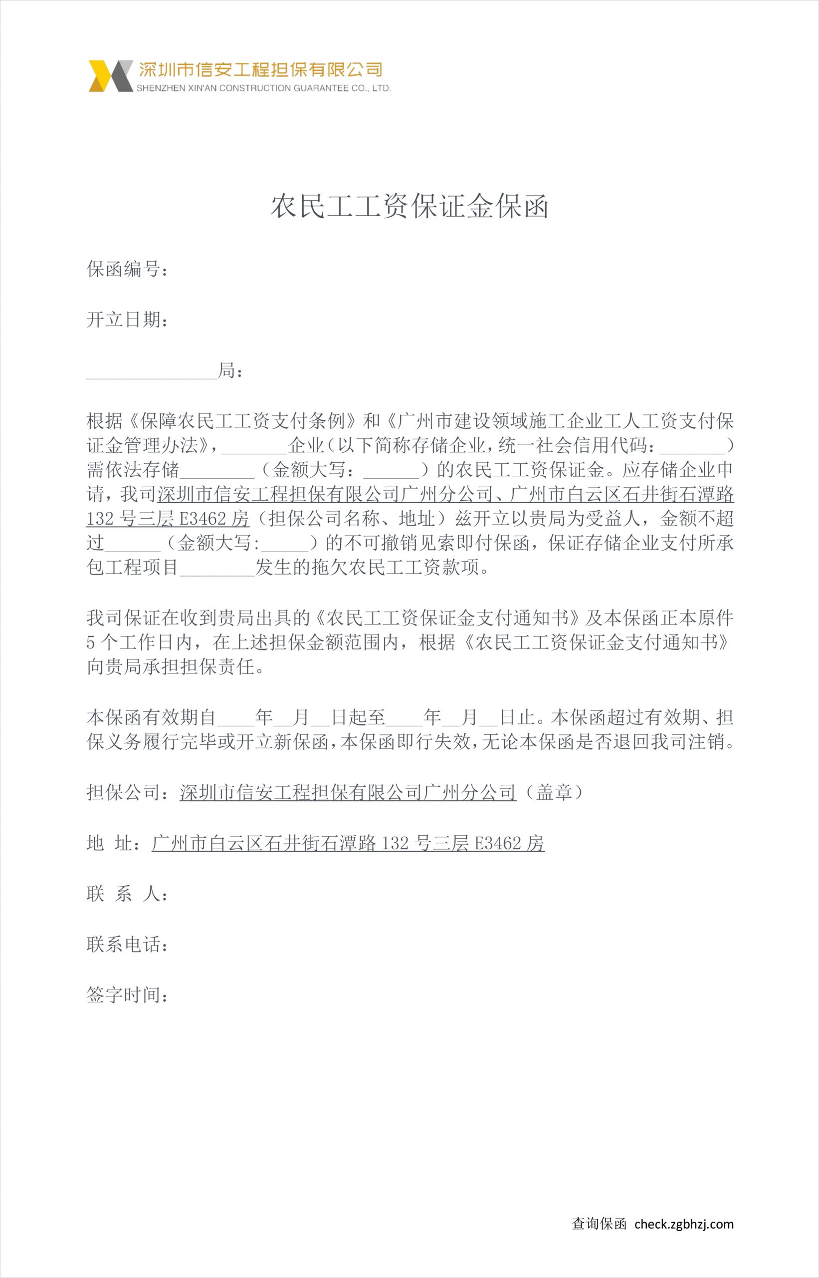 根据《保障农民工工资支付条例》和《广州市建设领域施工企业工人工资支付保证金管理办法》,_______企业(以下简称存储企业,统一社会信用代码:_______)需依法存储________(金额大写:______)的农民工工资保证金。应存储企业申请,我司(担保机构名称、地址)兹开立以贵局为受益人,金额不超过______(金额大写:_____)的不可撤销见索即付保函,保证存储企业支付所承包工程项目________发生的拖欠农民工工资款项。