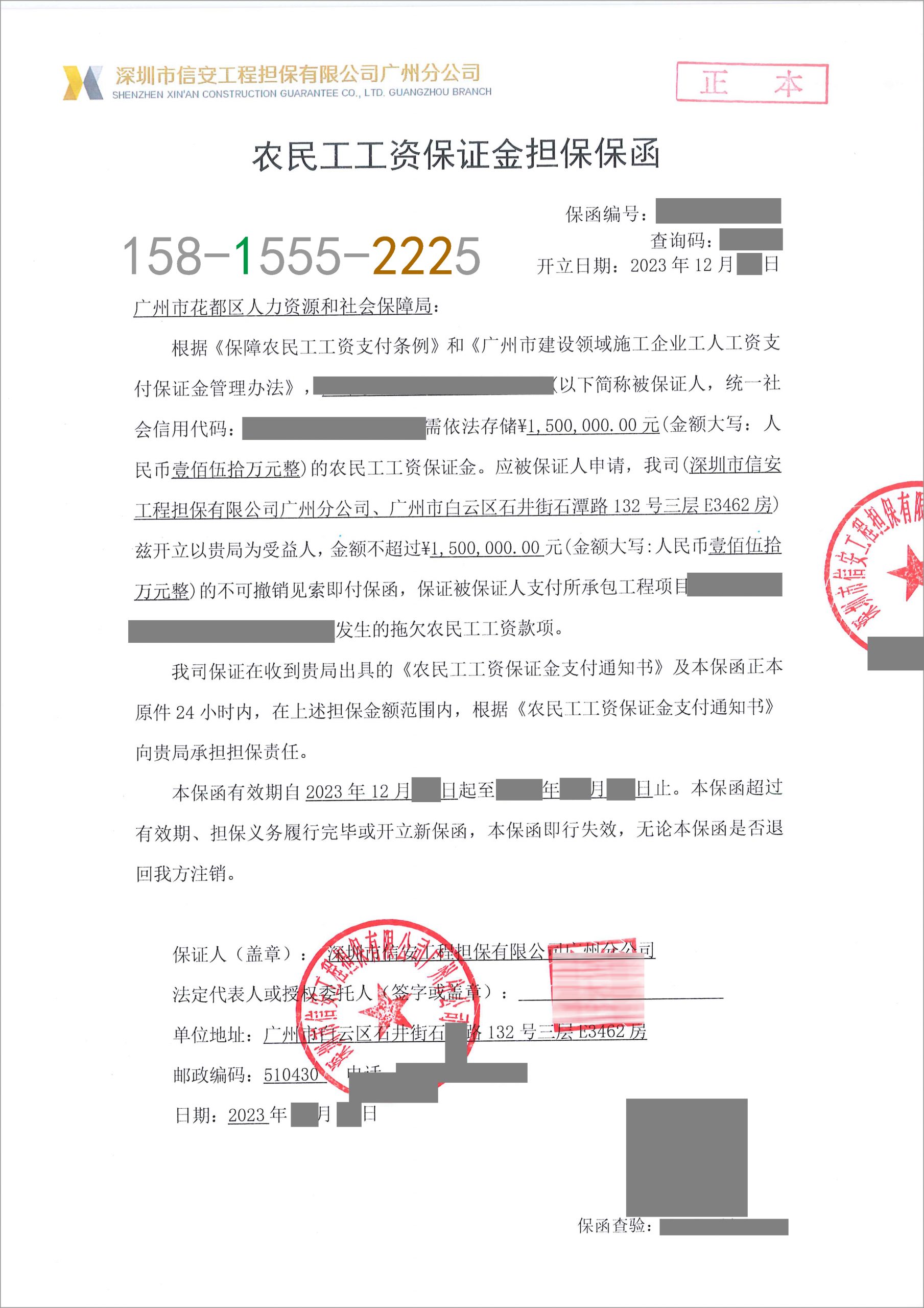 我司深圳市信安工程担保有限公司广州分公司入围广州市天河区,白云区,黄埔区,花都区,番禺区,南沙区,从化区,增城区,海珠区 农民工工资支付保函备案担保机构,办理商业农民工工资支付保函,资料简单,手续费低,出函时间最快半小时,欢迎新老客户联系。
