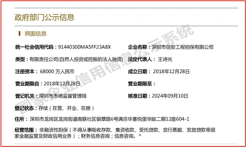 我司深圳市信安工程担保有限公司注册资本变更(注册资金、资金数额等变更):10000万元人民币变更为68000万元人民币(+58000万元人民币)