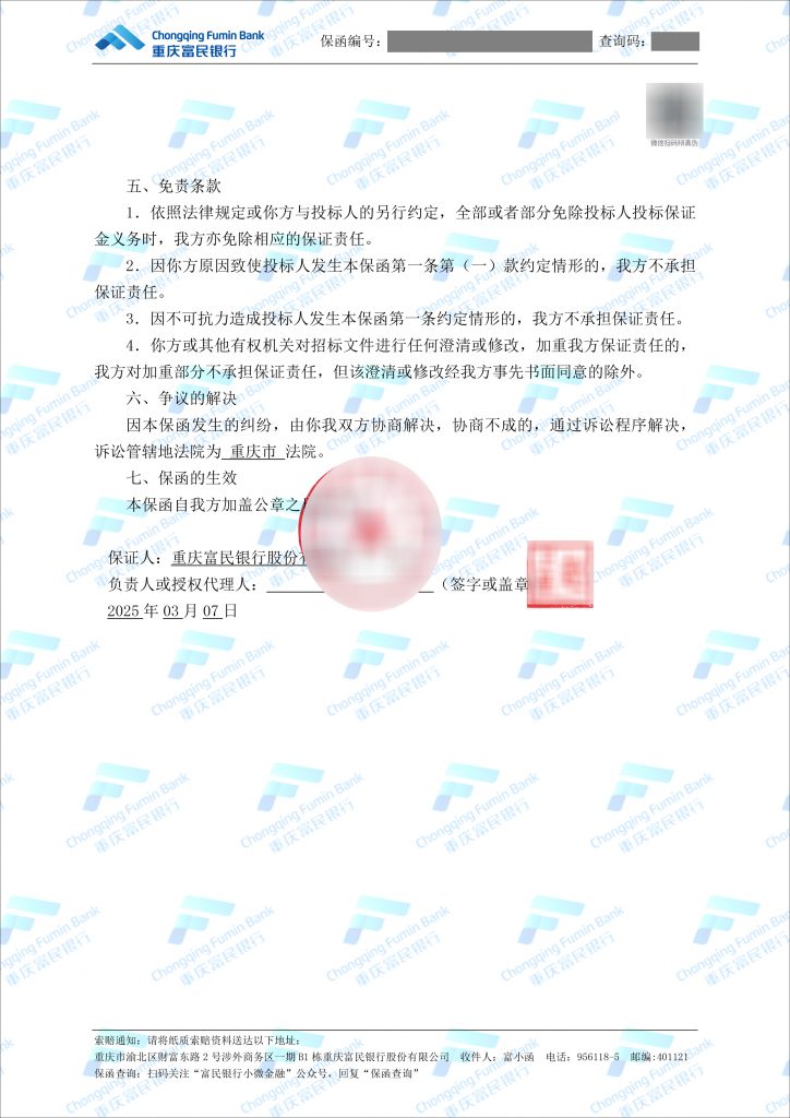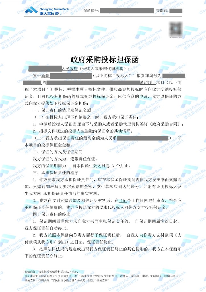 回答:我司代办银行和担保公司出具的政府采购投标担保函。本次招标文件中,要求提交银行出具的政府采购投标担保函。我司按照招标文件指定的保函格式,出具重庆富民银行的电子保函,当天出函,不需要寄出,投标人自行彩印出来即可做纸质保函使用。