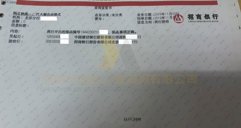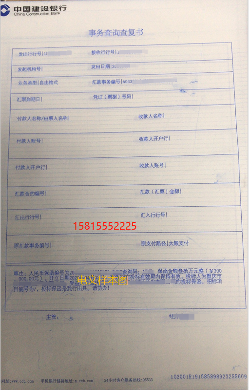 当然也可以由客户指定一家银行(可以发给任何一家银行不只是建行喔),提供银行全称和行号,开具保函的银行直接发出此份电文。
