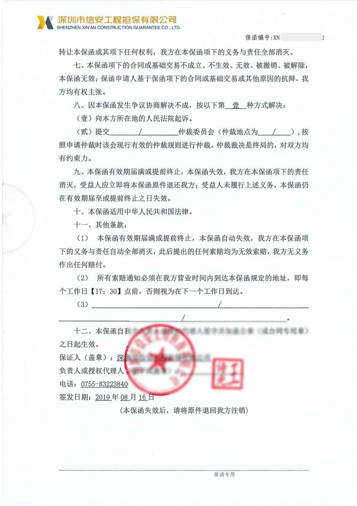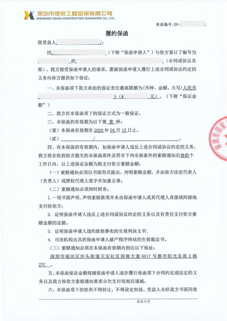 某单位和某房地产公司签署了建筑安装合同,按照合同约定,需要办理一份银行保函。但因承包人基本户银行办理银行保函的周期长,需要预存50%保证金方可办理。经过双方协商,发包人接受商业履约保函。该承包人联系我司后,经过查看合同,公司近三个月流水,我司评判该公司经营正常,项目盈利,免保证金出具了此份保函。