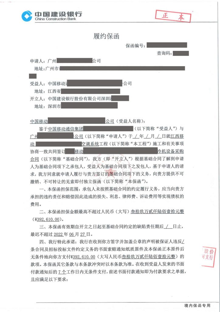 履约保函 移动项目 不可撤销见索即付独立格式 | 深圳市信安工程担保有限公司