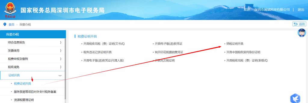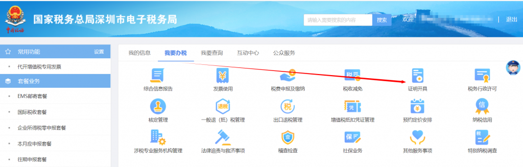 首页 – 我要办税 – 证明开具 – 税费证明开具 – 纳税证明开具