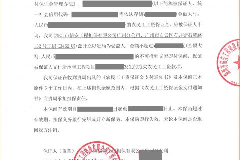 农民工工资保证金担保保函 保函编号:查询码: 广州市天河区人力资源和社会保障局:根据《保障农民工工资支付条例》和《广州市建设领域施工企业工人工资支付保证金管理办法》,*****(以下简称被保证人,统一社会信用代码:*****)需依法存储¥*****元(金额大写:人民币*****)的农民工工资保证金。应被保证人申请,我司(深圳市信安工程担保有限公司广州分公司、广州市白云区石井街石潭路132号三层E3462房)兹开立以贵局为受益人,金额不超过¥*****元(金额大写:人民币*****)的不可撤销见索…