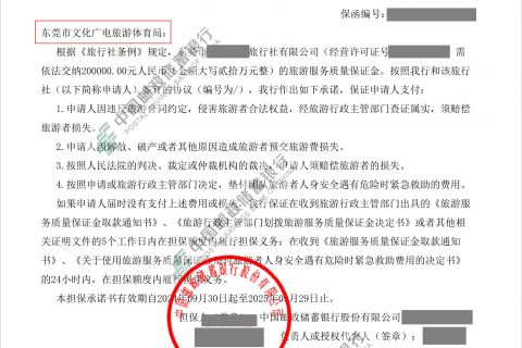 我司深圳市信安工程担保有限公司积极开展旅游服务质量保证金银行担保承诺书保函业务。2024年9月30日,我司开出一笔东莞市旅游服务质量保证金银行保函。 受理条件是:需要取得旅行社经营许可证。 出函时间:4个工作日。 出函问题:请问对旅行社的流水、资金情况是否有要求?回答:没有要求,新成立无流水的旅行社皆可办理。 出函银行:邮政储蓄银行东莞市区内的支行 欢迎东莞市、或者广东省内的旅行社与我司联系,为您办理免保证金的旅游保函业务。 东莞市文化广电旅游体育局关于按时补足旅游服务质量保证金的通知