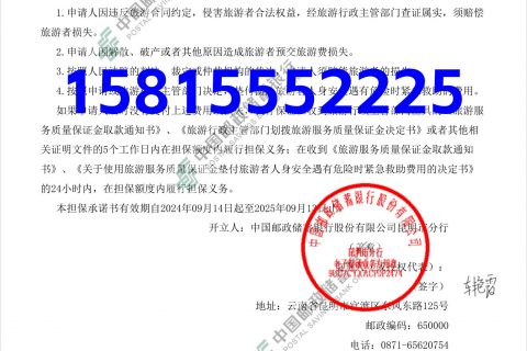 我司办理10笔昆明市旅游服务质量保证金银行承诺书保函。 申请单位为昆明市旅行社公司,受益人为昆明市文化和旅游局。担保期限1年。出函银行:邮政储蓄银行昆明市分行。 欢迎联系我司业务经理 158 1555 2225,不管是之前成立的旅行社,还是新开办的旅行社,只要有旅行社经营许可证即可办理。