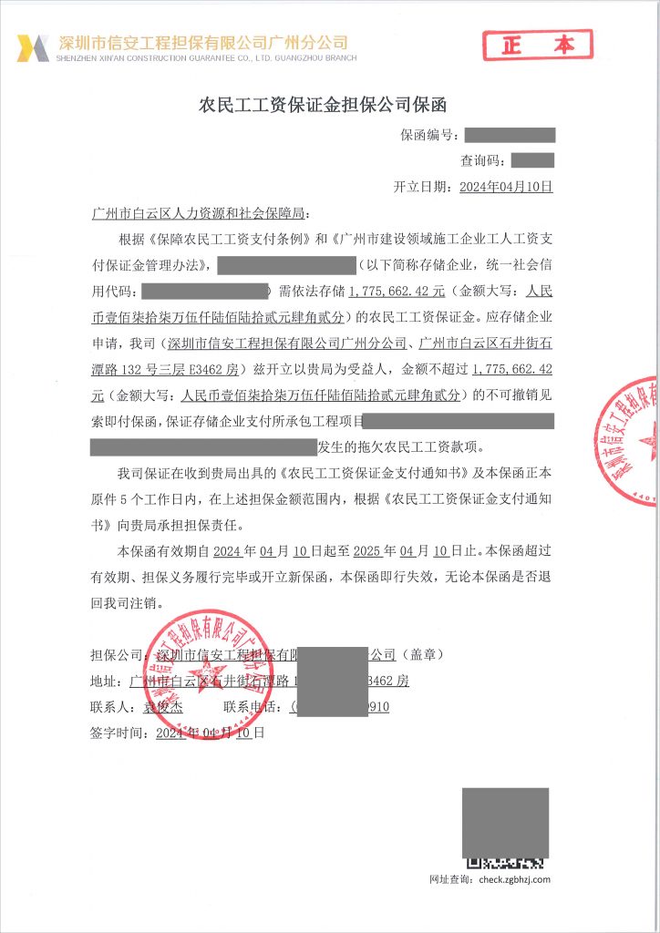 深圳市信安工程担保有限公司广州分公司入围广州市天河区,白云区,黄埔区,花都区,番禺区,南沙区,从化区,增城区,海珠区 符合办理农民工工资保证金条件的担保机构。